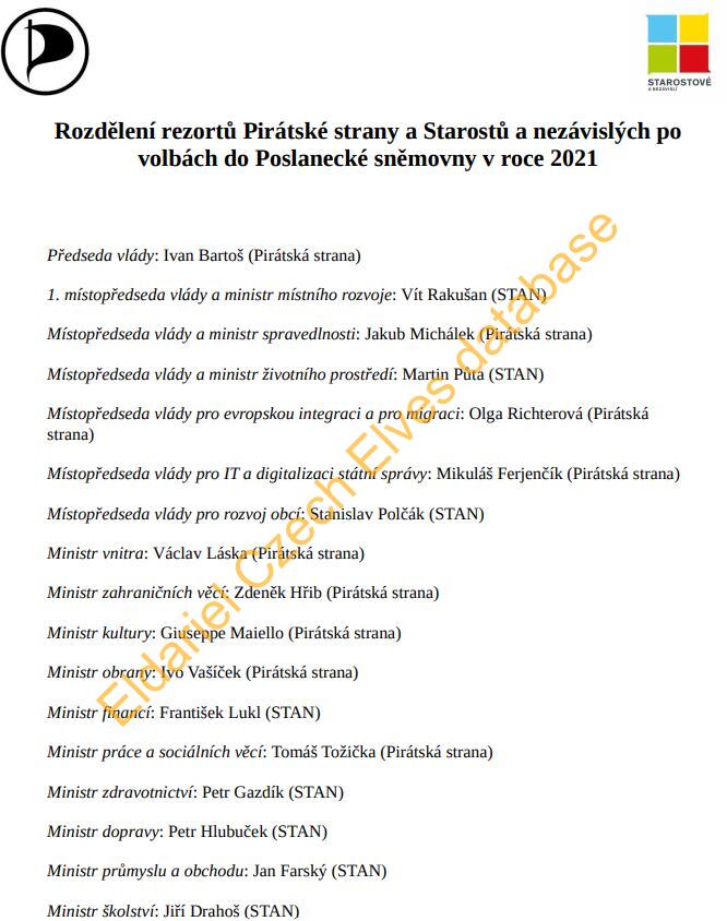 Podvržený text, vydávající se za oficiální dokument Pirátů a STANu, jenž má prezentovat, jak si po volbách rozdělí ministerské posty.