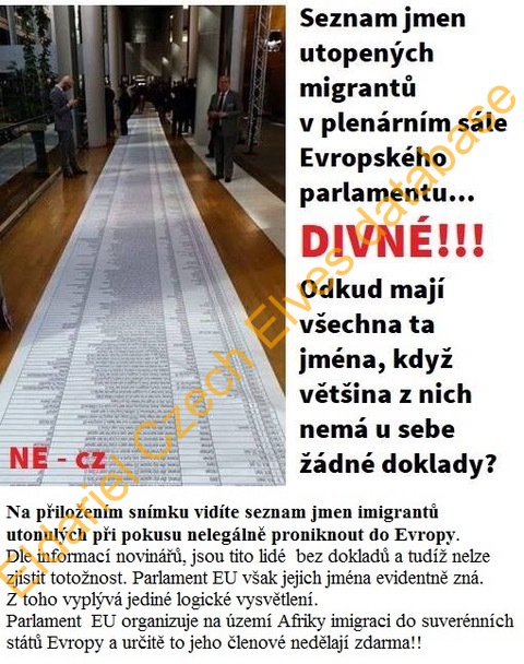Mem - foto seznamu utonulých migrantů v Evropském parlamentu. Tvůrce konspiruje, jak mohl seznam vzniknout, když uprchlíci nemají žádné doklady a z toho dovozuje, že Parlament EU organizuje v Africe migraci do Evropy, a že to jeho členové jistě nedělají zdarma.