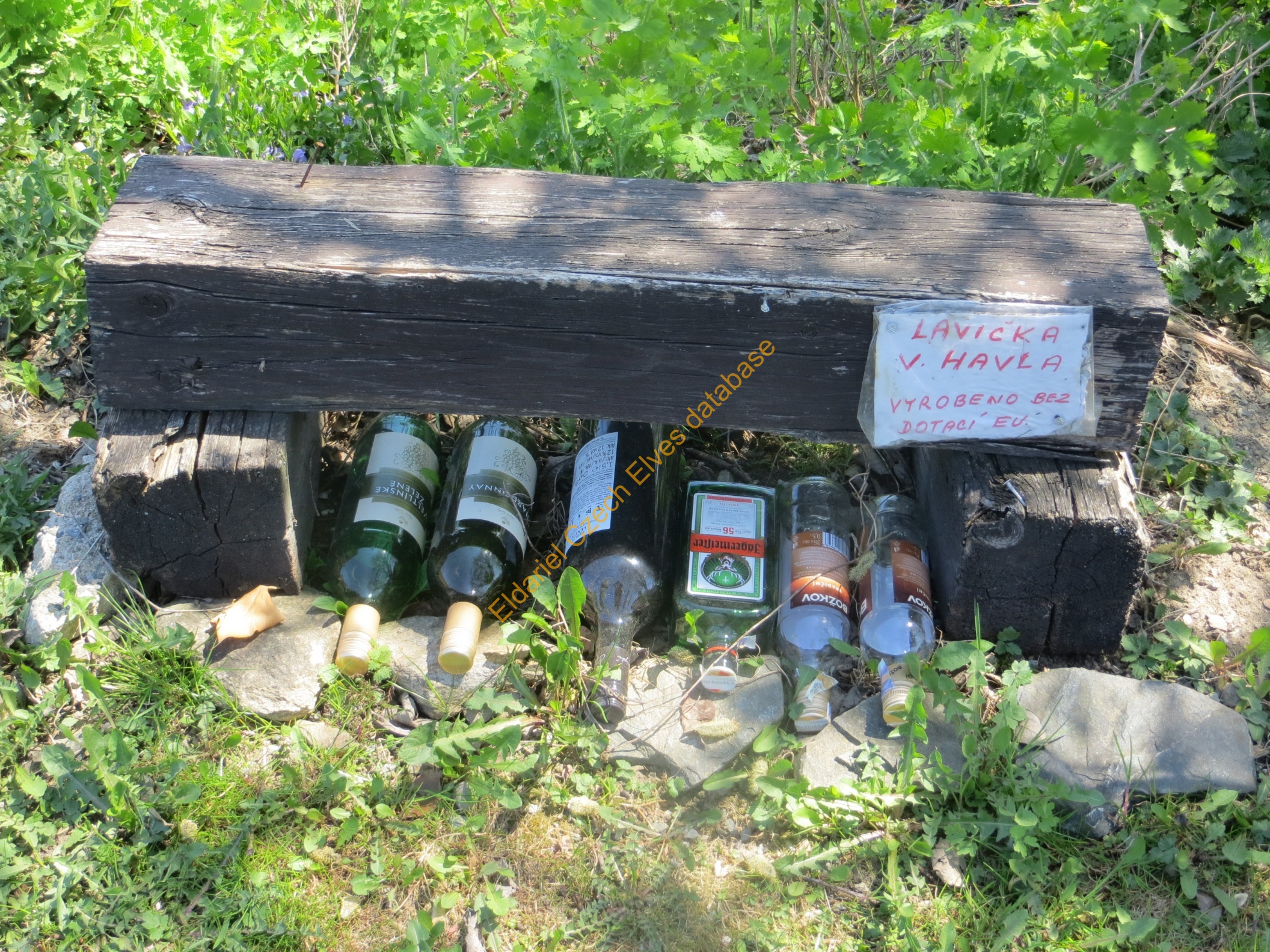 Obrázek improvizované lavičky z neopracovaných dřevěných hranolů, pod níž jsou prázdné lahve od alkoholu, s cedulkou "Lavička V. Havla vyrobeno bez dotací EU". Podobné s ID 4909, 5096 - oproti tehdejšímu místu Jakubovice jsou nyní uvedeny Klimkovice.