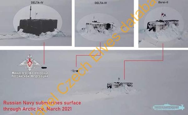 Text + 3x obrázek. Oslava ruského ponorkového loďstva a letectva. 3 ruské ponorky třídy Borej (ve skutečnosti 1x Borej a 2x Delta IV)j s 16 balistickými raketami Bulava (Delta IV mají Siněva) v 03/2021 prolomily 1,5 m led a vynořily se 300 m na dostřel od břehů USA (skutečnost - v kruhu 300 m od sebe). Pro USA to má být varování, aby se nepokoušely rozpoutat válku na Ukrajině. Dále měly nad severním pólem proletět stíhačky MIG-31, schopné útočit hypersonickými střelami Kinžal.