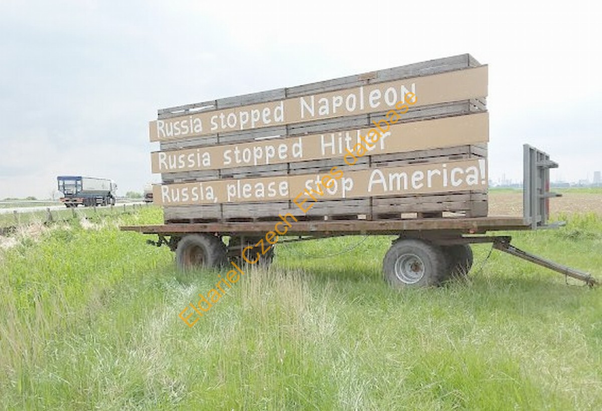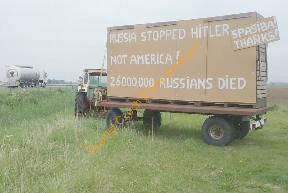 2x foto; holandský farmář měl v roce 2017 ke dni vítězství u dálnice rozmístit vozy, kde děkuje Rusku. To je pravým osvoboditelem, děkuje mu také za za zastavení Hitlera a Napoleona, a nyní ho vyzývá k zastavení USA.