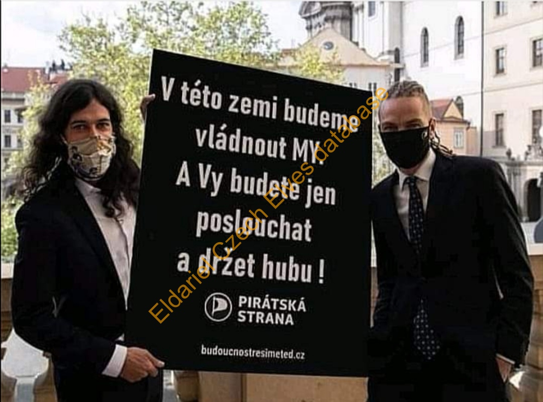 Upravený obrázek Bartoše a Pikala, jak drží ceduli s nápisem „V této zemi budeme vládnout MY. A Vy budete jen poslouchat a držet hubu!" (Originál: https://twitter.com/PiratIvanBartos/status/1255061969662545921) . Jako ID 10204 a 10524.