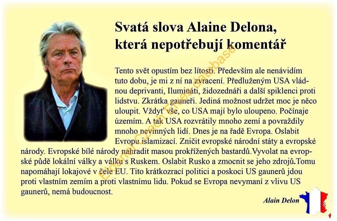 Zdokumentovaný hoax, údajné výroky Alaina Delona, které nikdy neřekl. USA vládnou ilumináti a židozednáři rozvracející ostatní země. V Evropě chtějí zničit národní státy islamizací a masovou migrací. Za pomocí EU chtějí vyvolat válku s Ruskem. Také na https://www.pozitivnisvet.cz/tento-svet-opustim-bez-litosti-tvrdi-alain-delon/