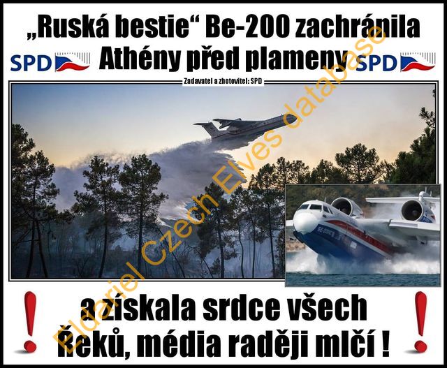 Ruské letadlo „Beriev-200“ v Řecku změnil situaci v oblasti hašení lesních požárů a získal si srdce řeckých občanů. Athény byly zachráněny ruskými letadly a naše slavná média mlčí. Na fotce logo SPD.