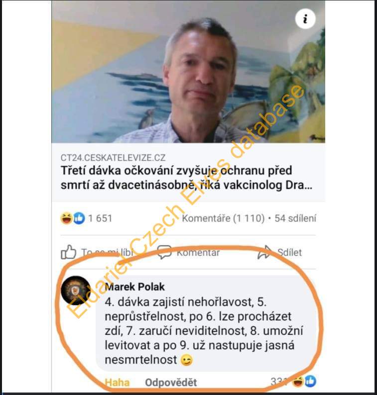 Screenshot vtipného komentáře na Facebooku, vysmívajícího se třetí dávce očkování. Čtvrtá dávka zajistí nehořlavost, pátá neprůstřelnost atd.