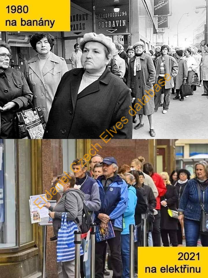 6 obrázků reagujích na energetickou krizi a útočících na koaliční politiky. Dříve se stála fronta na banány a dnes se stojí fronta na elektřinu.