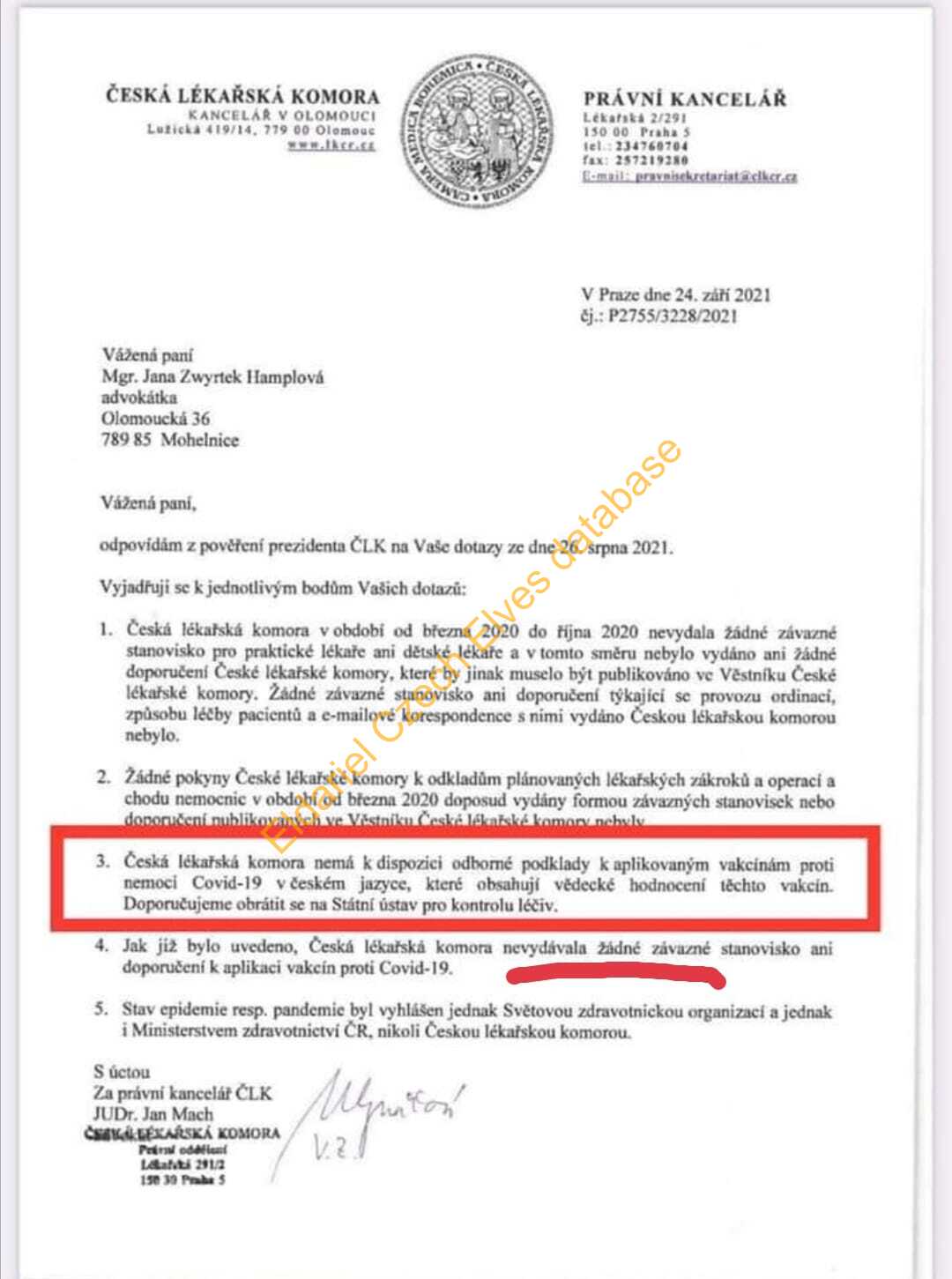Dopis České lékařské komory adresovaný Janě Zwyrtek Hamplové, ze dne 24.9.2021, odpovídající na její dotazy. ČLK nevydala závazné stanovisko pro praktické lékaře, nedala pokyn k odkladu plánovaných zákroků v nemocnicích, nemá odborné podklady k vakcínám v češtině, nevydala doporučení k aplikaci vakcín, ani nevyhlásila stav epidemie.