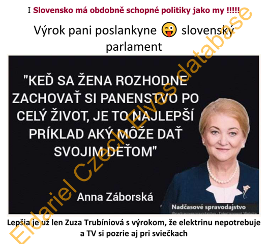 Mem, zrejmě ze slovenské satirické stránky; konzervativně-křesťanská poslankyně SNR Záborská se měla dopustit krajně nepravděpodobného výroku, že pokud se žena rozhodne zachovat si panenství po celý život, je to nejlepší příklad, jaký může dát svým dětem. Dále je zmíněna Trubíniová (tehdy Greenpeace), že nepotřebuje elektřinu, alébrž si televizi pustí i při svíčkách (doložený hoax). Pisatel ovšem uvěřil, diví se a obě připodobňuje k naší předsedkyni PSP ČR.