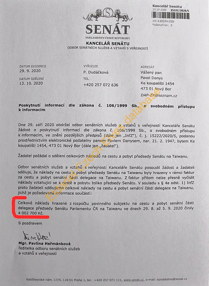 Vyjádření Kanceláře Senátu k nákladům na cestu Miloše Vystrčila na Taiwan.