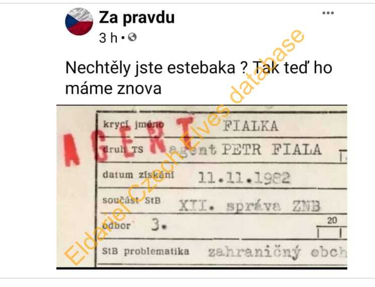Obsahem přílohy je doklad, že Petr Fiala byl spolupracovník StB pod krycím jménem Fialka