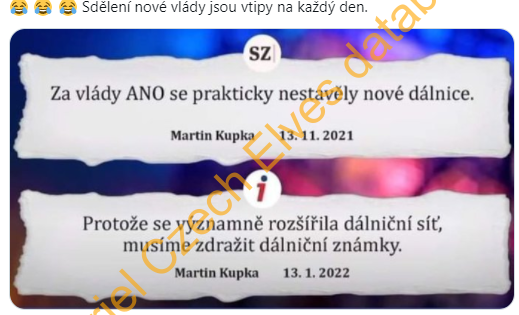 "vtipný text" kdy Martin kupka jako opoziční politik říkal, že se nové dálnice nestavěly, ale jako ministr chce zdražit dálniční známky z důvodu rozšíření dálniční sítě.