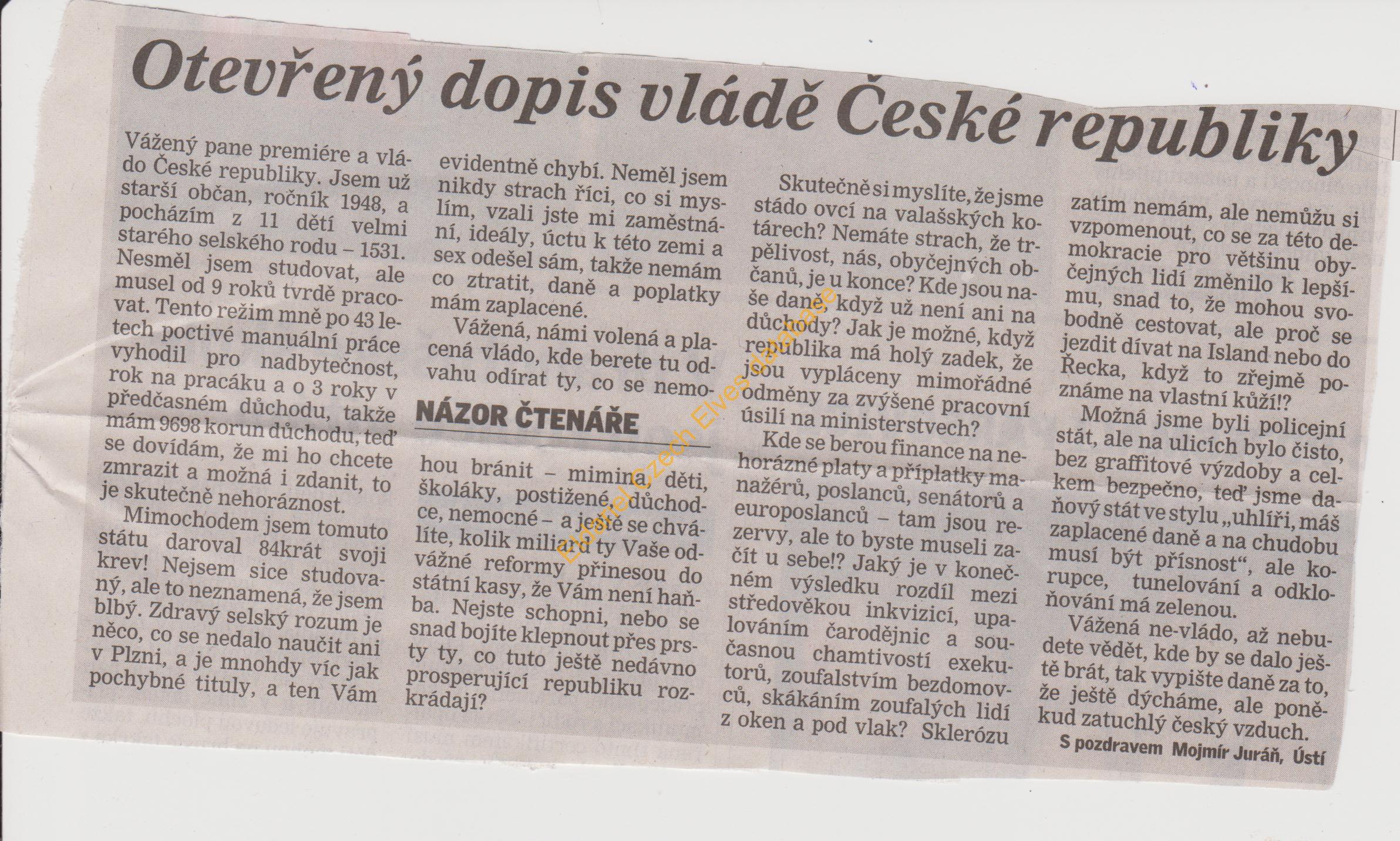 Článek formou "Otevřený dopis" cca 10 let starý, zřejmě nejen obecního kverulanta Juráně z Ústí (Vsetínsko). Polistopadový vývoj je špatně, politici, manažeři trží, občané, především senioři jsou odíráni. Dřívější policejní stát nebyl až tak špatný. Jsme krmeni tzv. svobodou, ale ve skutečnosti trpíme. Jako ve středověku inkvizice - vyjde to nastejno - zoufalí lidé skáčí z oken, pod vlak a umírají.