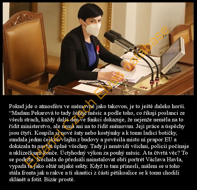 Pokud jde o ahnosfént ve sněmovně jako takovou, je to ještě daleko horší. "Madam Pekarová to tady šéfuje měsíc a podle toho, co říkají poslanci ze všech strach, každý další den ve fimkci dokazuje, že nejenže neměla na to řídit ministerstvo, ale nemá ani na to řídit sněmovnu. Její práce a úspěchy jsou čtyři. Koupila si nové šaty nebo kostýmky a k tomu ladící botičky, sundala jednu českou vlajku z budovy a pověsila místo ní prapor EU a dokázala tu nas*at úpině všeclmy. Tady ji nenávidí všiclmi, policií počínaje a uklízečkami konče. Úctyhodný výkon za pouhý měsíc. A ta čtvrtá věc? To se podržte. Nechala do předsálí nainstalovat obří portrét Václava Havla, vypadá to jako oltář nějaké sekty. Když to tam přinesli, málem se u toho stála fronta jak u rakve a ti skautíci z části pětikoalice se k tomu chodili sklánět a fotit. Bizár prostě.