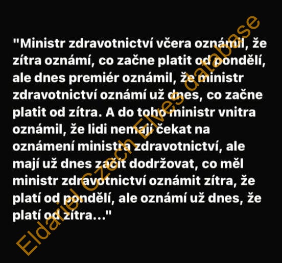"Ministr zdravotnictví včera oznámil, že zítra oznámí, co začne platit od pondělí, ale dnes premiér oznámil, že ministr zdravotnictví oznámí už dnes, co začne platit od zítra. A do toho ministr vnitra oznámil, že lidi nemají čekat na oznámení ministra zdravotnictví, ale mají už dnes začít dodržovat, co měl ministr zdravotnictví oznámit zítra, že platí od pondělí, ale oznámí už dnes, že platí od zítra..."