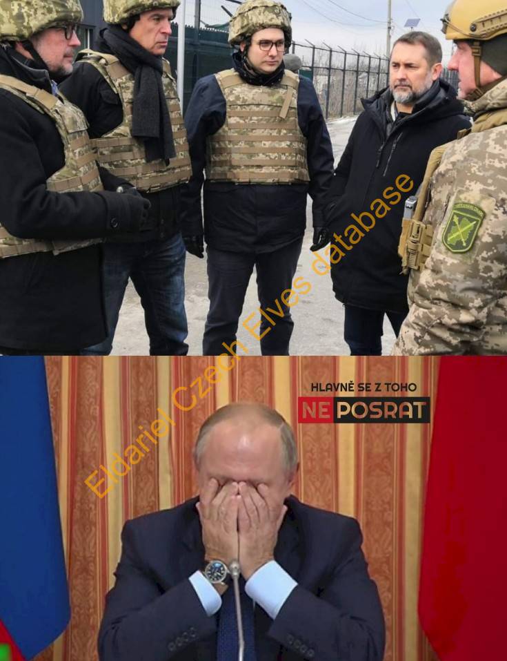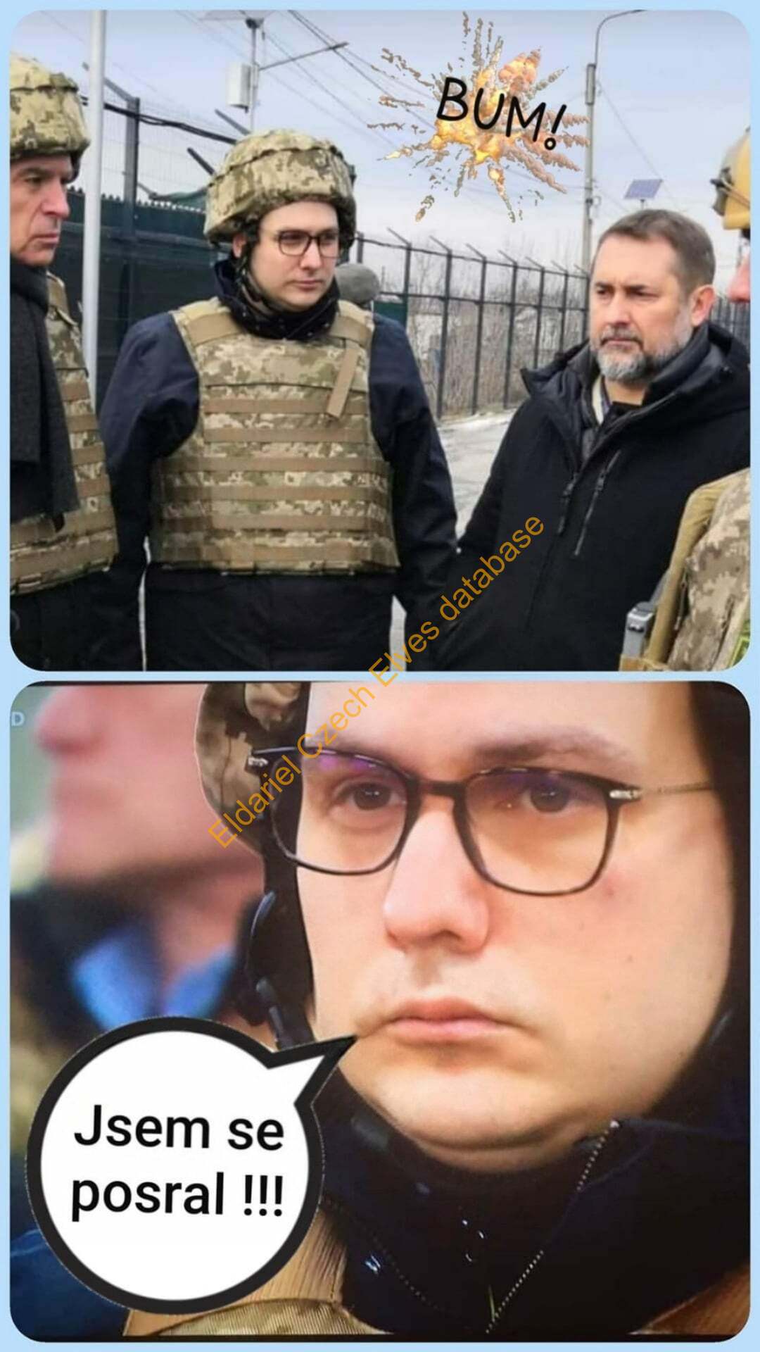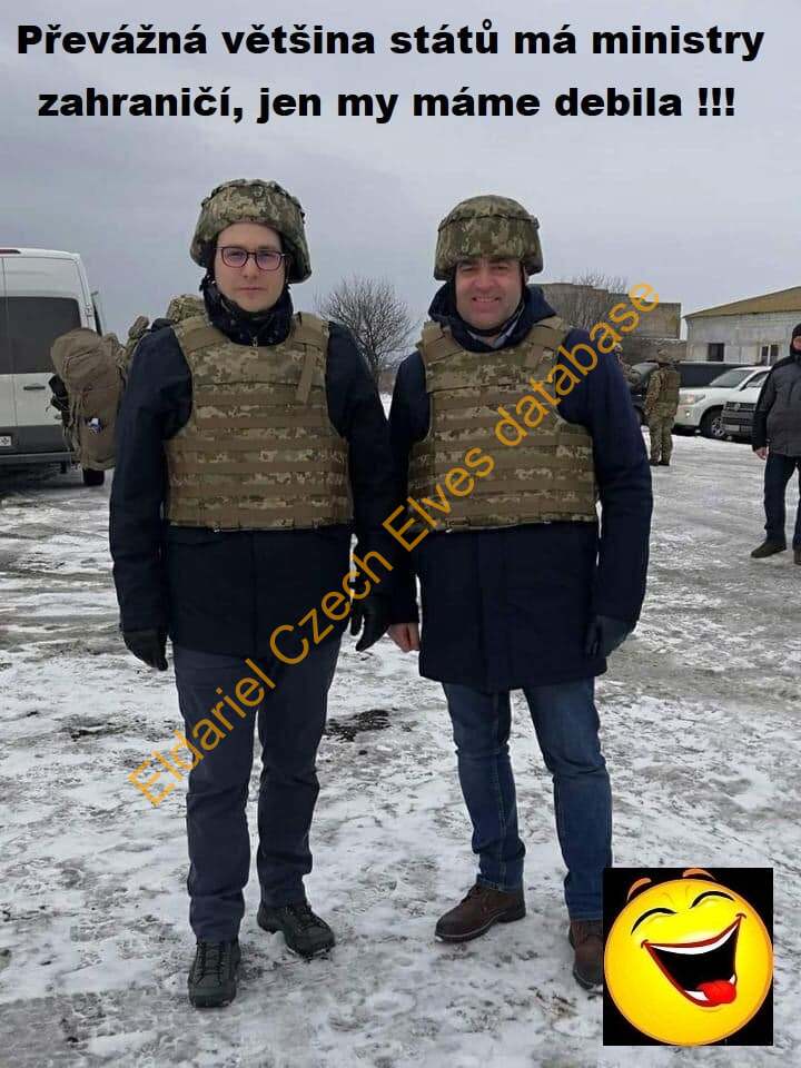Zesměšňující komentáře k cestě Jana Lipavského na Ukrajinu. Doplněno fotografiemi Lipavského a dalších vládních politiků.
