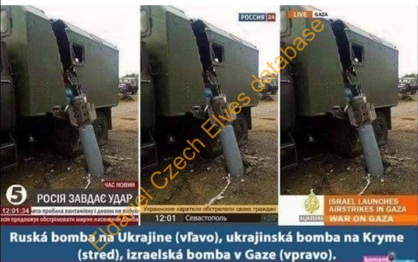 Třikrát ta samá fotka bomby, která zasáhla armádní vozidlo. S popiskem "Ruská bomba na Ukrajině, ukrajinská bomba na Krymu, izraelská bomba v Gaze." Takto měla údajně o této události referovat různá média.