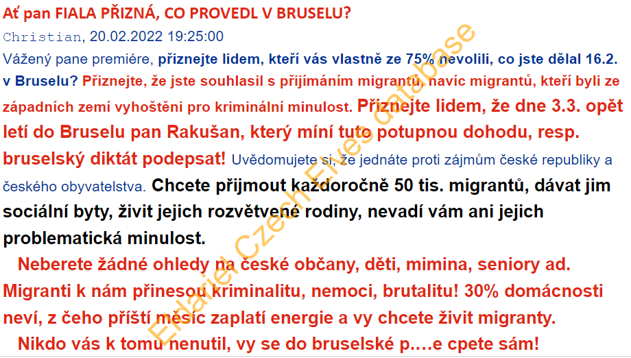 Obr. příloha s datem únor 2022, útočící pro změnu na premiéra Petra Fialu, kterého obviňuje z dohody o přijímání kriminálních migrantů do ČR