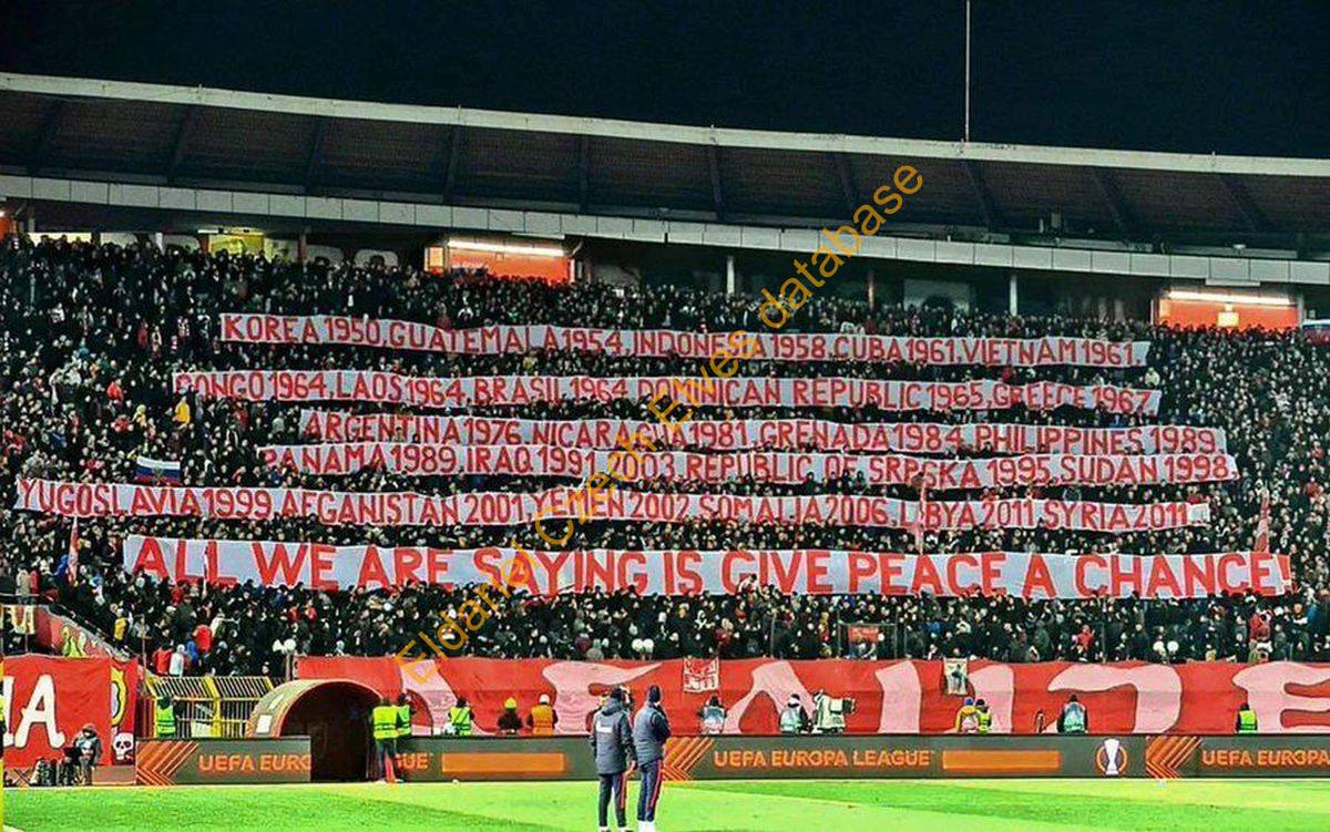 "Dejte šanci míru," aneb tvrdá lekce pro západ. Fanoušci srbského týmu Crvena Zvezda zaplnili bělehradský stadion "Rajko Mitic" při zápase se skotským týmem FC Rangers a v jednu chvíli vyslali do světa zprávu: "Dejte šanci míru." Na transparentech se objevil seznam všech imperiálních válek, kterých se Spojené státy účastnily v minulém a tomto století, a zazpívali protiválečnou píseň "Give peace a chance" od Johna Lennona. Není třeba připomínat, že při těchto vojenských intervencích byly zabity desítky milionůosob, v etně žen a dětí.