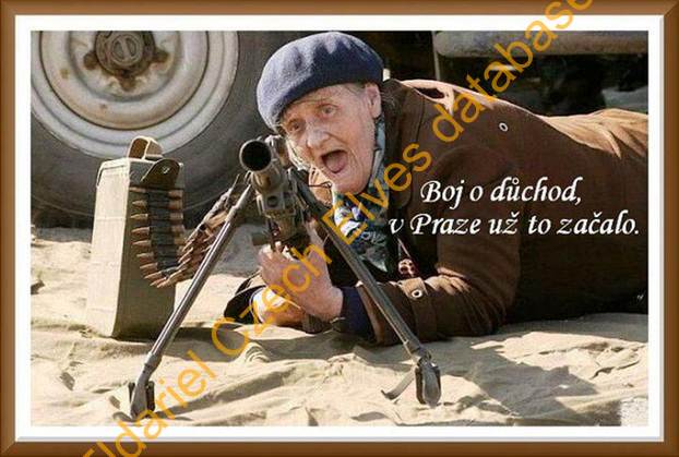 Obrázek 1: důchodce ležící u zbraně a text: boj o důchod, v Praze už to začalo.