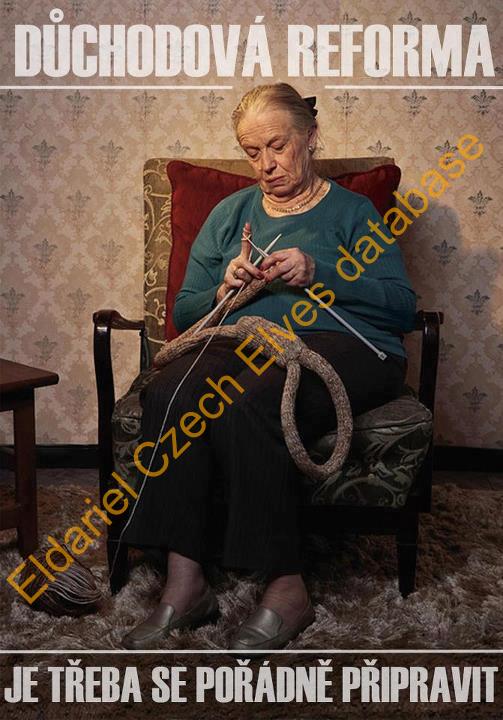 Obrázek 2: důchodkyně si plete obří smyšku a text: důchodová reforma. Je třeba se pořádně připravit.