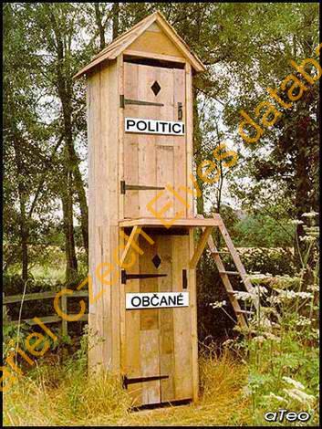 Obrázek 3: dvojpatrová kadibudka, nahoře nápis "POLITICI", dole nápis "OBČANÉ".