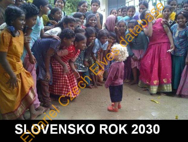 Obrázek 4: horda malých Romů si pobaveně prohlíží malého blonďáka, nápis: Slovensko 2030.