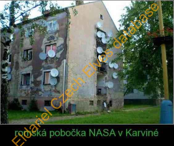 Obrázek 5: zanedbaný obytný dům se spoustou satelitních talířů a text: romská pobočka NASA v Karviné.