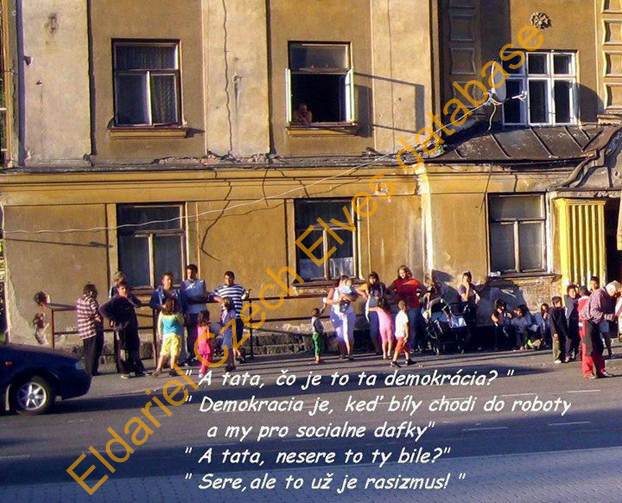 Obrázek 7: skupina romů před polorozpadlým domem a text: "A tata, čo je to ta demokrácia?" "Demokracia je, keď bily chodí do roboty a my pro socialne dafky." "A tata, nesere to ty bile?" "Sere, ale to už je rasizmus."