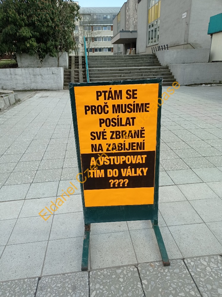Cedule s nápisem proti posílání zbraní na Ukrajinu.