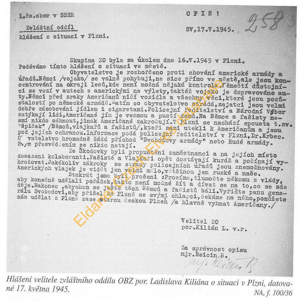 Text exposlance KSČM Jana Klána o tom, že v dnešní době je zakázáno mluvit o některých událostech kolem osvobození Československa. Například o americkém bombardování Brna, Plzně a jiných měst. V další příloze je hlášení velitele zvláštního oddílu OBZ o situaci v Plzni, ze dne 17.5.1945. V tom si Ladislav Kilián stěžuje na chování americké armády a doufá v příchod Svobodovy armády a vyhnání Američanů.