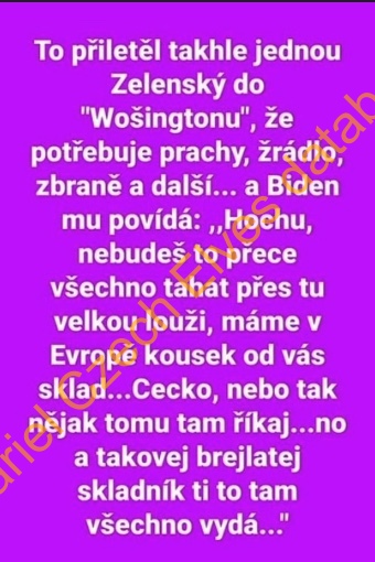 Vtip kterak Zelenský přiletí do Washingtonu a žádá Bidena o zbraně. Ten mu odpoví, že v ČR mají sklad, kde mu vše vydají.