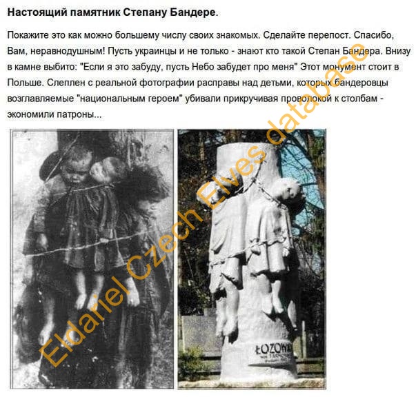 Fotka pomníku, na kterém jsou děti přivázané ostnatým drátem, a text útočící na Ukrajinu, podle kterého se jedná o oběti Ukrajinci oslavovaného Bandery. Dle factcheckingu na https://mythdetector.ge/en/why-was-a-statue-associated-with-stepan-bandera-taken-down-in-poland/ však byl pomník v polském městě Przemyśl svržen v roce 2008, protože se ukázalo, že se nejedná o obětí Ukrajinské povstalecké armády.