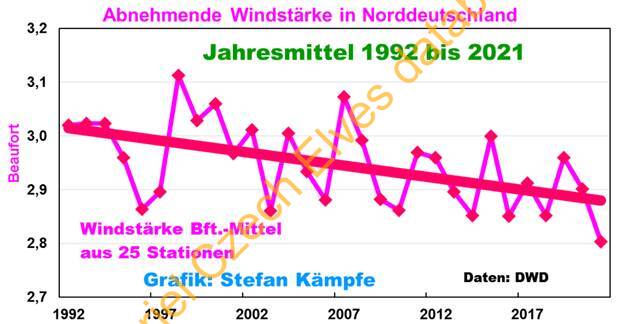Na 25 stanicích měří od roku 1992 až do roku 2021 tlak, respektive sílu větru. Ten neustále klesá s přibývaícím počtem vystavěných vrtulí.
