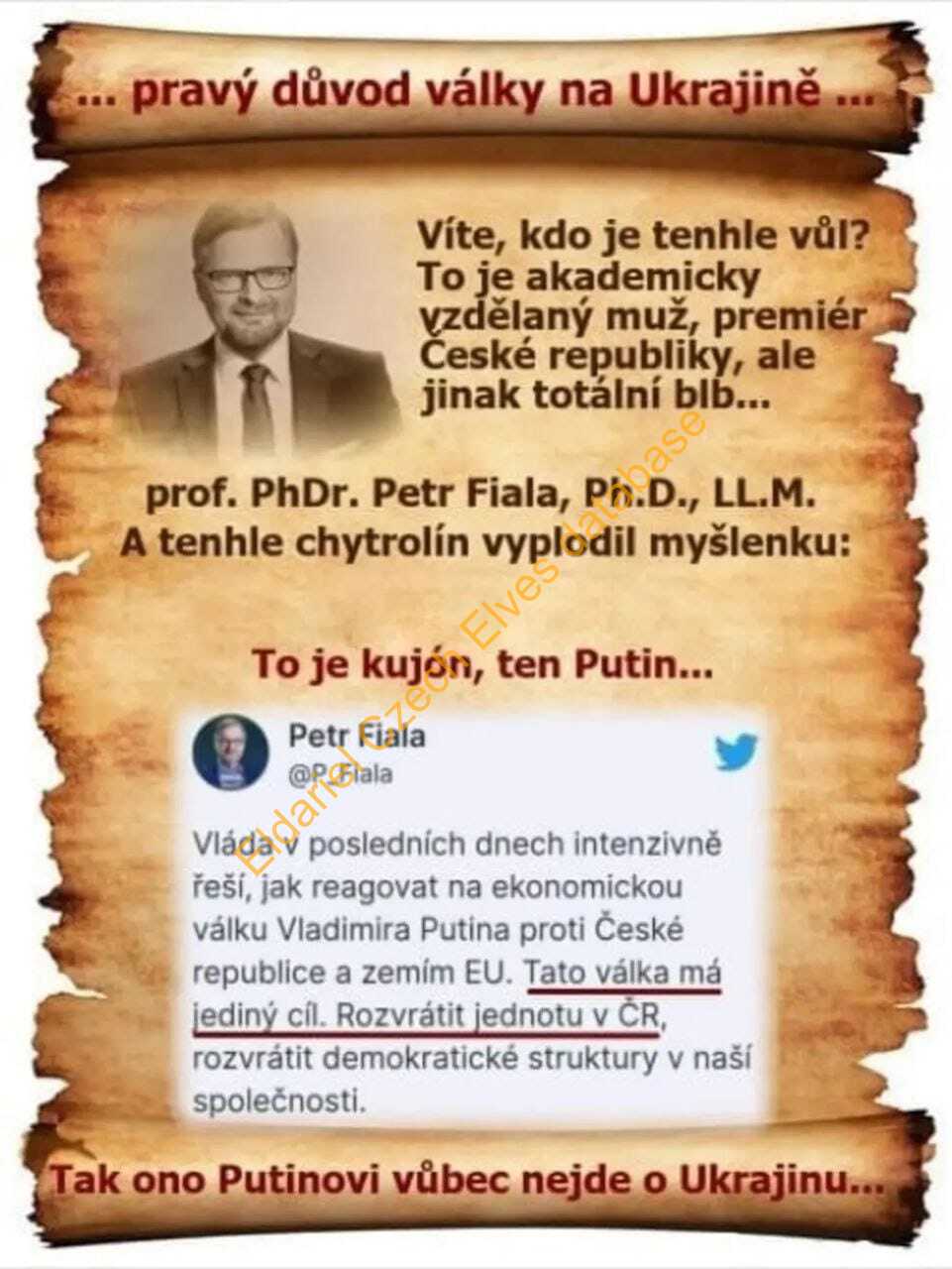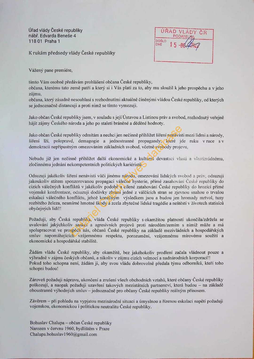 Mail obsahuje obrázkové memy, zaměřené zejména proti současnému premiérovi ČR Petrovi Fialovi, také podporující spolupráci s Ruskem, odmítnutí podpory Ukrajiny, narativ "dřív bylo líp", také proti Pirátům a vládám jako takovým, proti USA atd. Je zde také dopis občana vládě ČR požadující vyhlášení neutrality ČR.