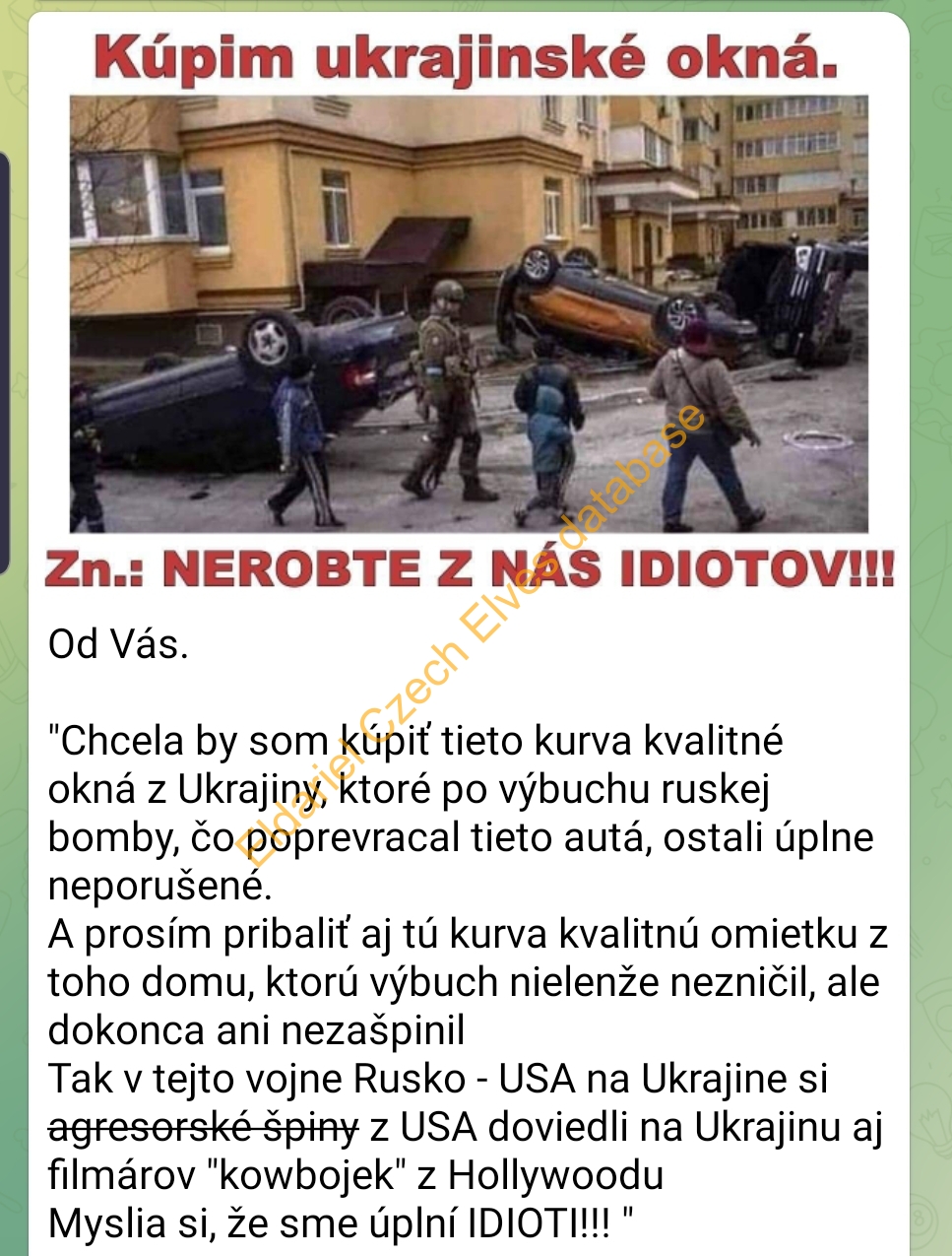 V příloze fotka s auty převrácenými na střechu, u kterých stojí neponičené domy. U této fotky komentář, že agresoři z Ameriky si do války mezi Ruskem a USA na Ukrajině dovezli i filmaře z Holywoodu