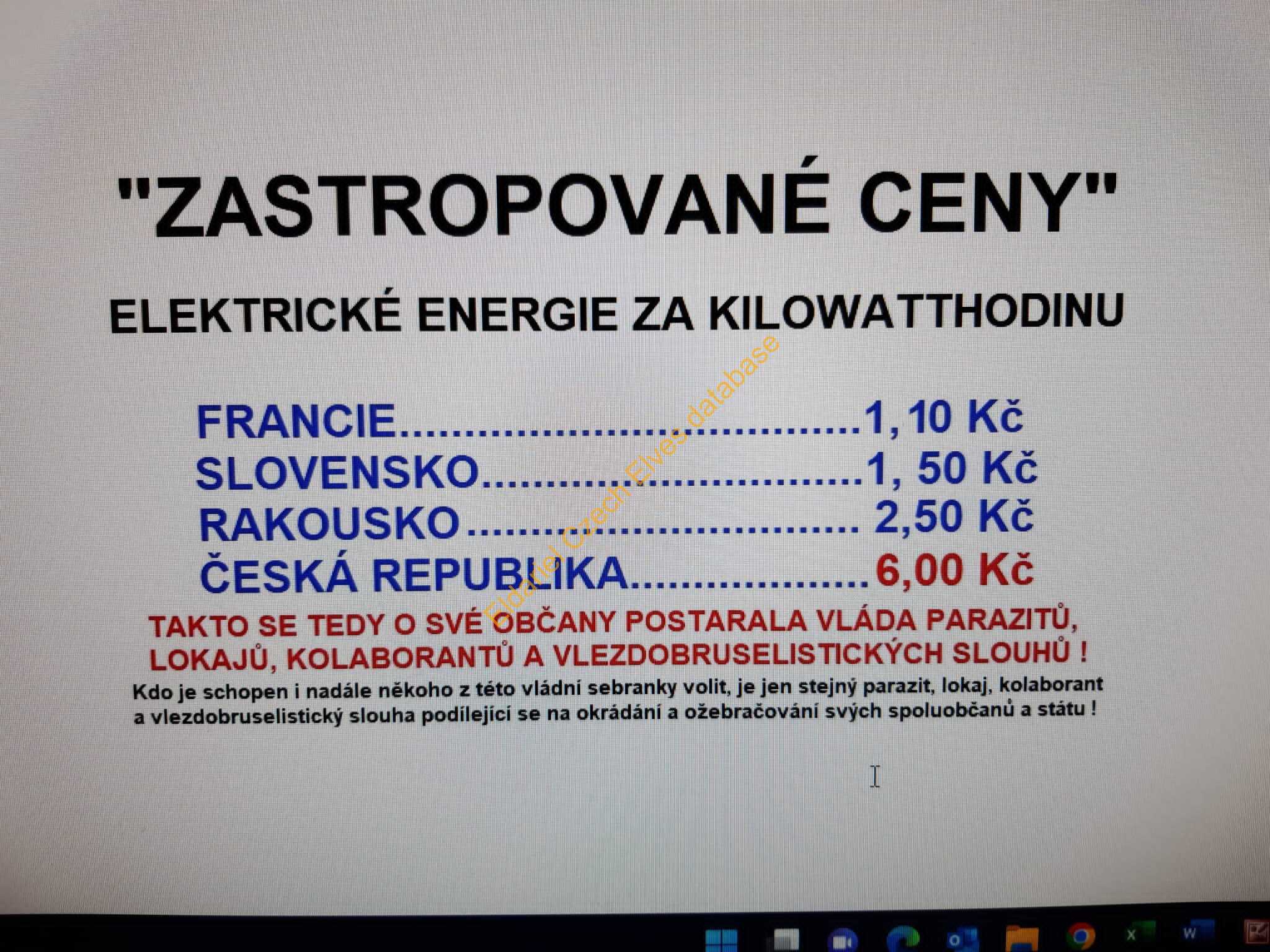 Leták, který manipulativně srovnává výši zastropovaných cen elektřiny v ČR, Rakousku, Francii a na Slovensku. Máme prý vládu lokajů, parazitů, kolaborantů a vlezdobruselistických slouhů. Samozřejmě není uvedeno, že např. rakouský cenový strop se vztahuje jen na část spotřeby, netýká se nákladů na elektrické vytápění, atd. Slovensko navíc nemá model zastropování dořešen.