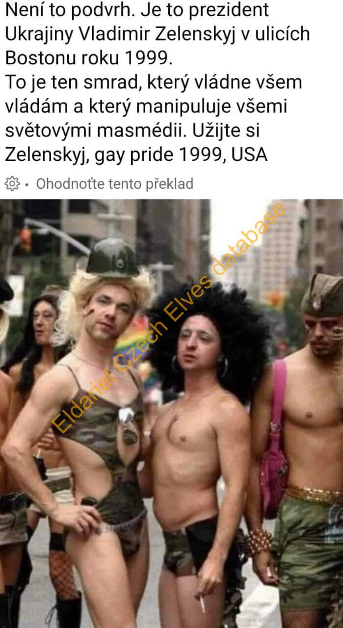 Fotografie údajně z Gay Pride 1999 v Bostonu, na které je člověk podobný současnému prezidentovi Ukrajiny. Foto má potvrzovat celkovou zkaženost Zelenského, který podle textu u obrázku v dnešní době všem vládne a manipuluje všemi médii.