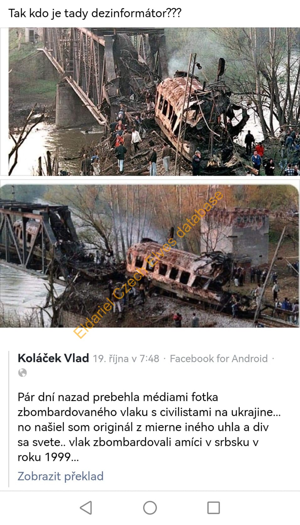 Další z cyklu Jak nám média lžou o dění na Ukrajině. Fotografie bombardovaného vlaku ze Srbska z roku 1999, kterou údajně média vydávají za vybombardovaný vlak na Ukrajině. Dle factcheckingu na https://demagog.cz/diskuze/zniceny-srbsky-vlak-v-kontextu-valky-na-ukrajine přišel s informací o tom, že se jedná vlak na Ukrajině tento twitterový účet https://twitter.com/paleomanmd/status/1580969113140178944