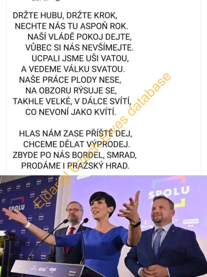 fotka představitelů koalice SPOLU a k ní veršovánka o tom, jak špatně to vedou, vše Caps Lockem, aby to bylo víc pravda