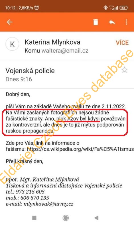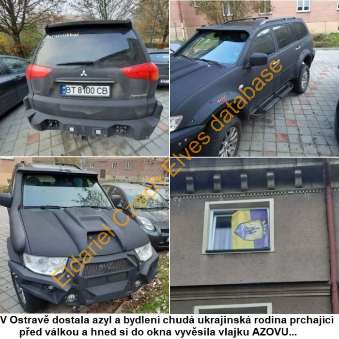 Mail o tom, že v Ostravě dostala "chudá" rodina ukrajinského nacisty byt. Obsahuje dvě přílohy: 1) Fotka drahého auta s ukrajinskou SPZ a vyvěšená vlajka Azova v okně domu. 2) V druhé příloze vyjádření z Vojenské policie, že pluk Azov byl kdysi považován za kontroverzní, ale dnes je to již mýtus podporovaný ruskou propagandou.