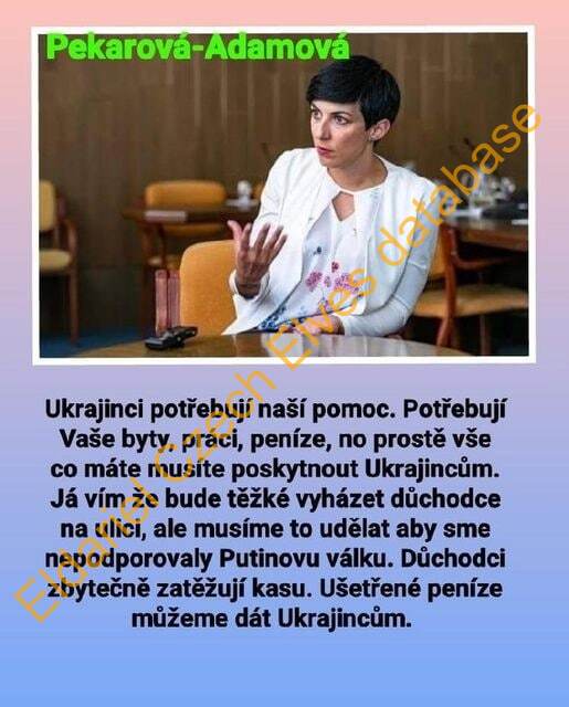 Smyšlený výrok Markéty Pekarové Adamové. Důchodci zbytečně zatěžují kasu. Musíme je vyházet na ulici a vše co máte (byty, práci, peníze), musíte poskytnout Ukrajincům.