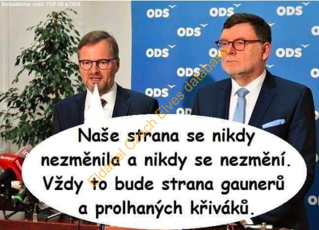 7. Fotografie Petra Fialy a Zbyňka Stanjury s textem: "Naše strana se nikdy nezměnila a nikdy se nezmění. Vždy to bude strana gaunerů a prolhaných křiváků."