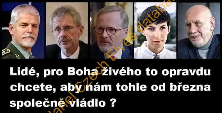 seskládaný obrázek vládních politiků a Petra Pavla s textem "Lidé, pro boha živého, to chcete, aby nám tohle od března společně vládlo?"