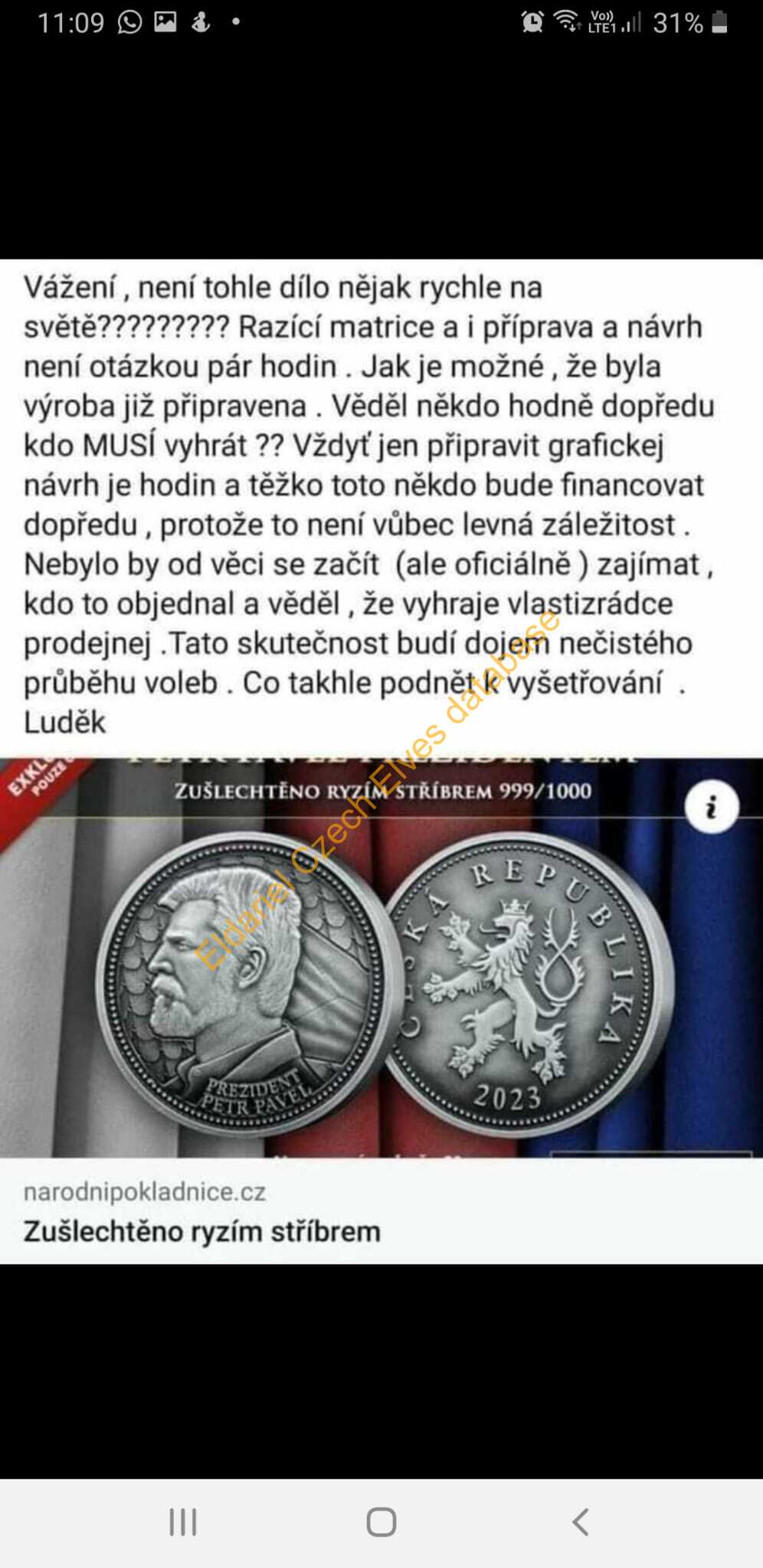 Vyfocená mince s podobiznou Petra Pavla krátce po vyhraných volbách. S textem, že to muselo dát mnoho práce a času a jak je možné, že už existuje - jedná se však jen o obrázek jak bude vypadat, ne skutečnou minci.