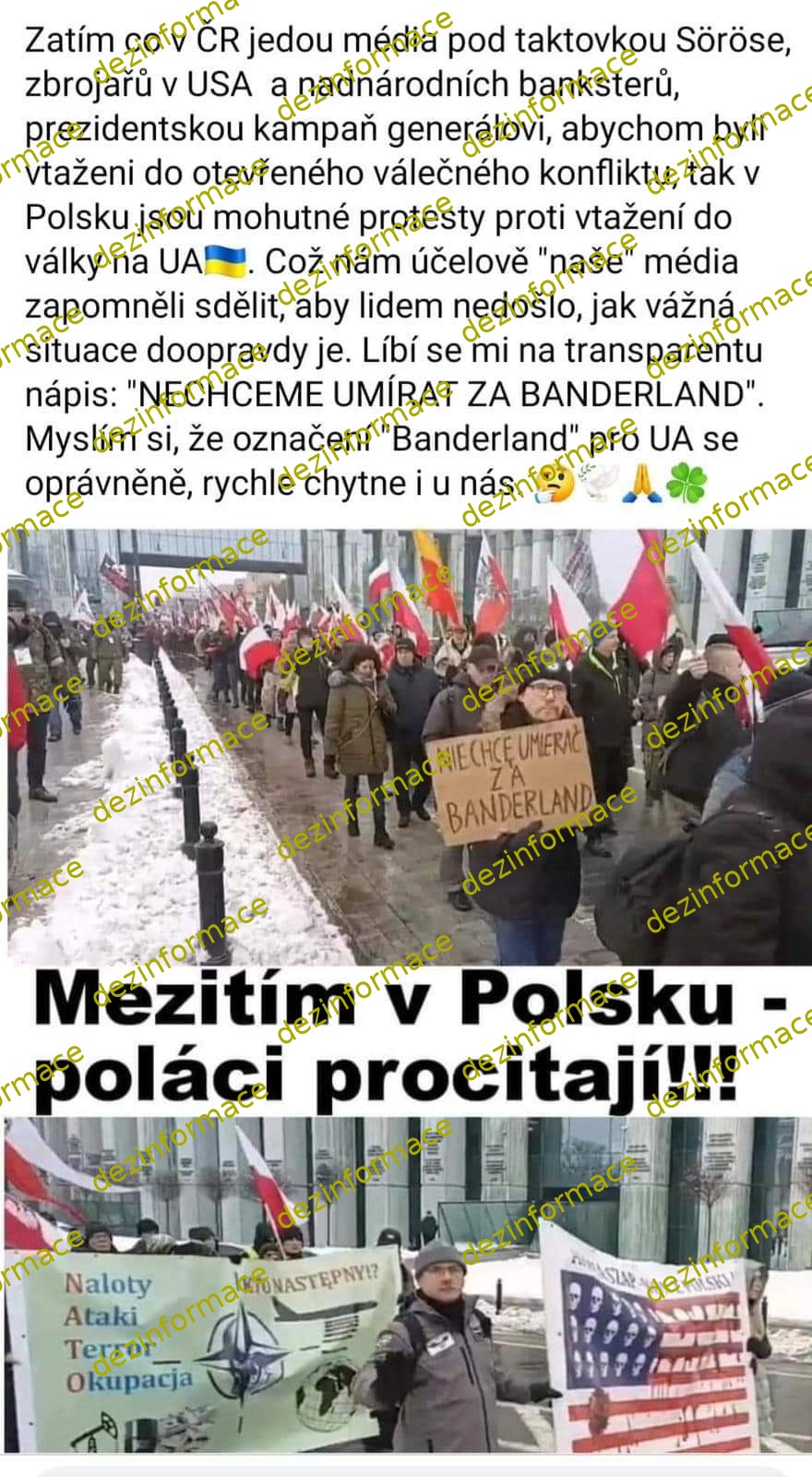 Zatím co v ČR jedou média pod taktovkou Sorose, zbrojařů v USA a nadnárodních banksterů, prezidentskou kampaň generálovi, abychom byli vtaženi do otevřeného valečného konfliktu, tak v Polsku jsou mohutné protesty proti vtažení do války na UK sr. Což nám účelově "naše" média zapomněli sdělit, aby lidem nedošlo, jak vážná situace doopravdy je. Líbí se mi na transparentu nápis: "NECHCEME UMÍRAT ZA BANDERLAND". Myslím si, že označení "Banderland" pro UA se oprávněně, rychle chytne i u nás. t: