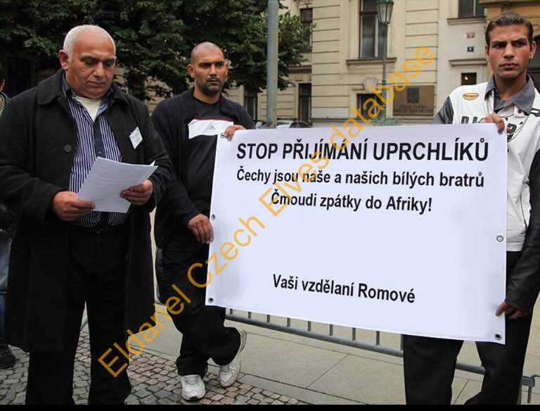 vtipný obrázek romů s transparentem proti uprchlíkům které nazývají čmoudy