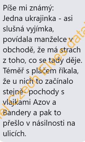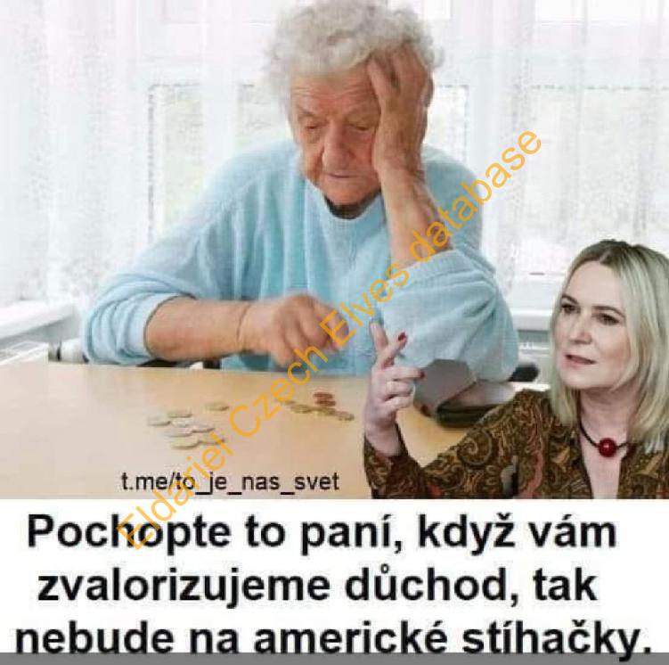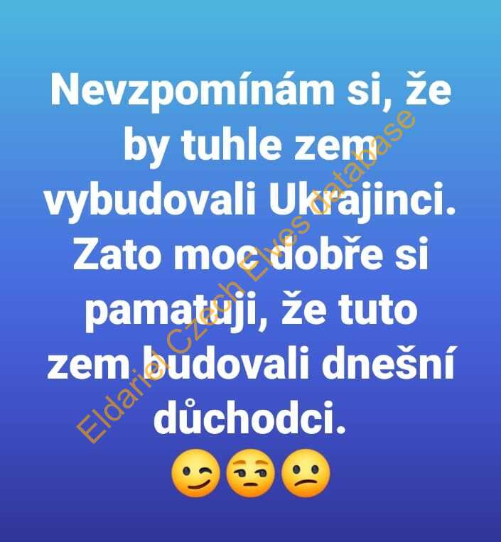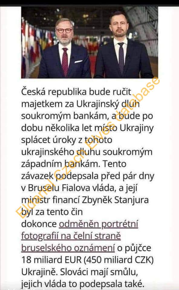 Přepsané texty z meme obrázků a pdf souborů: Nevzpomínám si, že by tuhle zem vybudovali Ukrajinci. Zato moc dobře si pamatuji, že tuto zem budovali dnešní důchodci. Česká republika bude ručit majetkem za Ukrajinský dluh soukromým bankám, a bude po dobu několika let místo Ukrajiny splácet úroky z tohoto ukrajinského dluhu soukromým západním bankám. Tento závazek podepsala před pár dny v Bruselu Fialova vláda, a její ministr financí Zbyněk Stanjura byl za tento čin dokonce odměněn portrétní fotografií na čelní straně bruselského oznámení o půjčce 18 miliard EUR (450 miliard CZK) Ukrajině. Slováci mají smůlu, jejich vláda to podepsala také. Vláda schválila o 1000,- menší červnovou valorizaci důchodů na 760,- korun. Důvod: zpomalování zadlužování. Hele vy morální giganti, my se nezadlužujeme kvůli důchodcům. My se zadlužujeme, protože financujeme půl Ukrajiny. A vůbec netušíme, kam ty miliardy jdou! Píše mi známý: Jedna ukrajinka - asi slušná vyjímka, povídala manželce v obchodě, že má strach z toho, co se tady děje. Téměř s pláčem říkala, že u nich to začínalo stejně- pochody s vlajkami Azov a Bandery a pak to přešlo v násilnosti na ulicích.