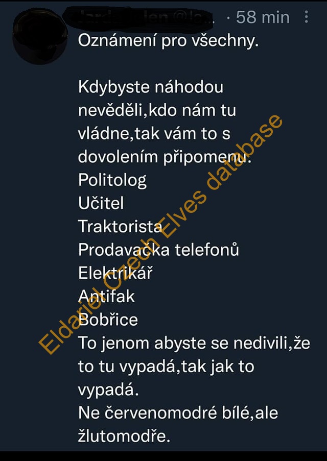 Oznámení pro všechny. Kdybyste náhodou nevěděli, kdo nám tu vládne,tak vám to s dovolením připomenu. Politolog Učitel Traktorista Prodavačka telefonů Elektrikář Antifak Bobřice To jenom abyste se nedivili,že to tu vypadá,tak jak to vypadá. Ne červenomodré bílé,ale žlutomodře.