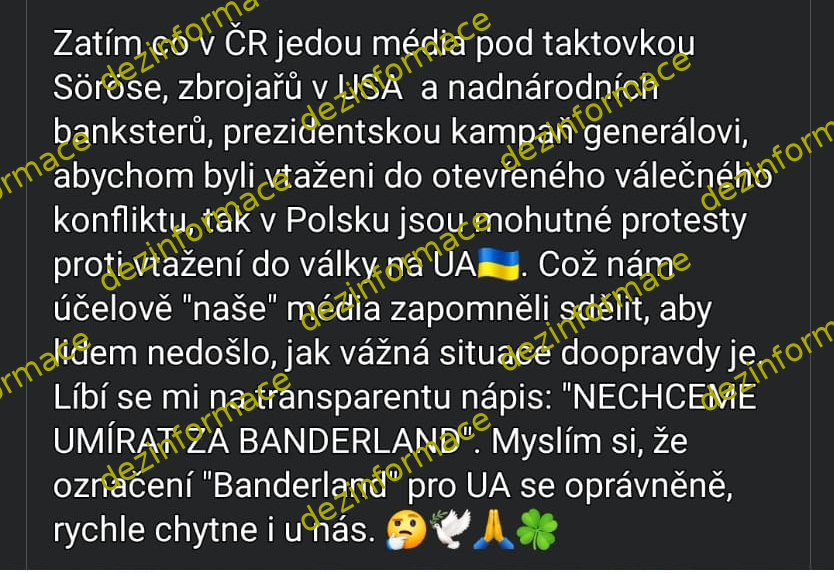Zatím co v ČR jedou média pod taktovkou Sorose, zbrojařů v USA a nadnárodních banksterů, prezidentskou kampaň generálovi, abychom byli vtaženi do otevřeného valečného konfliktu, tak v Polsku jsou mohutné protesty proti vtažení do války na UA. Což nám účelově "naše" média zapomněli sdělit, aby lidem nedošlo, jak vážná situace doopravdy je. Líbí se mi na transparentu nápis: "NECHCEME UMÍRAT ZA BANDERLAND". Myslím si, že označení "Banderland" pro UA se oprávněně, rychle chytne i u nás.