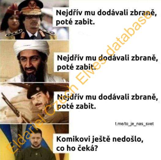 Fotky diktátorů a u nich text, Nejdřív jim dodávali zbraně pak byli zabiti, poslední Zelenský a u něho text: Komikovi ještě nedošlo, co ho čeká?